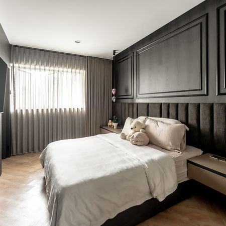 The bedroom is a tranquil retreat, featuring a luxurious bed for restful sleep, textured walls, and calming lighting, all in muted colors and soft fabrics. The bathroom combines spa-like serenity with modern functionality, showcasing dark tiles, modern fixtures, and an open shower for daily rejuvenation.
