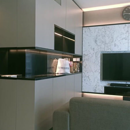 Step into a minimalist, contemporary home designed for comfort and serenity. The living area, with its plush sofa and soft throw blanket, is a haven of relaxation, bathed in natural light and surrounded by soothing neutral tones and clean lines.